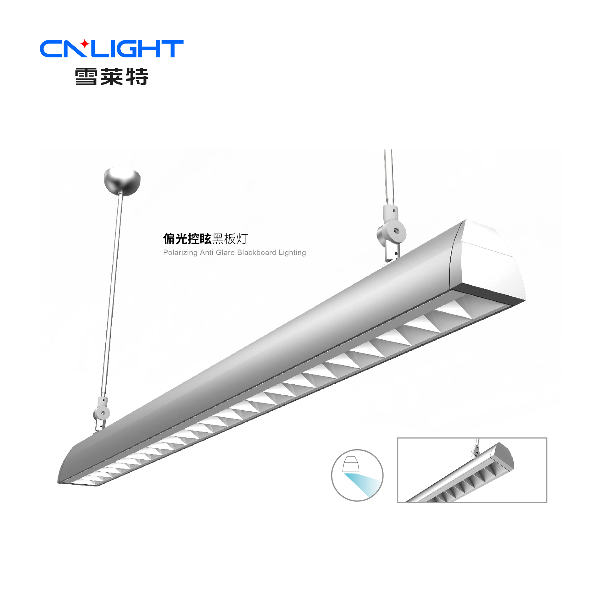 LED護(hù)眼黑板燈側(cè)向防眩,偏光式黑板燈,偏光透鏡加防眩格柵,老師位置無(wú)明顯眩光感,支持吸頂安裝,吊繩安裝,可調(diào)角度吊桿安裝,高PF無(wú)頻閃,高顯指,非調(diào)光(可定制可控硅或0-10V或DALI調(diào)光) -